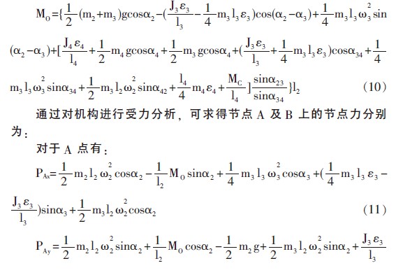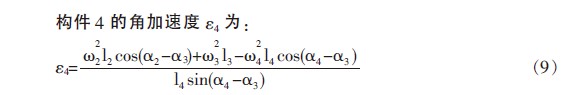 在圖1 所示的機(jī)構(gòu)中,設(shè)主動(dòng)件2 的輸入?yún)?shù)為α2;從動(dòng)件4 的 輸出參數(shù)為α4;各桿長(zhǎng)度為:li(i=1,2,3,4),MO 和MC 分別為輸入力矩和 輸出力矩;mi 和Ji 分別為各桿件的質(zhì)量和繞通過(guò)桿件質(zhì)心軸線的轉(zhuǎn)動(dòng) 慣量;ω2 為常量。 由虛位移原理, 可求得在輸出力矩MC 不變的情況下的輸入力矩 MO,即: