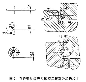 (3)由于卷邊坯件是經(jīng)預(yù)彎的,裝在楔滑塊頭部的卷邊凹模由楔推動(dòng)進(jìn)行推卷成形。卷邊變形過(guò)程及凹 模工作部分的設(shè)計(jì)見(jiàn)圖5。