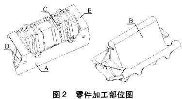 由于零件在各個(gè)方向都有型面,加工時(shí)要用專用銑夾將零件放置不同角度。用五坐標(biāo)立式機(jī)床加 工,再轉(zhuǎn)臥式機(jī)床加工兩端頭。因此靠夾具定位面設(shè)計(jì)不同角度來(lái)滿足數(shù)控加工。圖2所示為零件的加工部位。