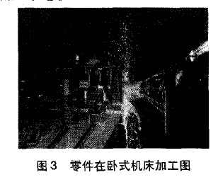 采用五坐標(biāo)立式機(jī)床加工部位A及其所在平 面外形,鉆基準(zhǔn)孔,作為后續(xù)臥式加工的基準(zhǔn)。加工此部位,不需夾具,可直接放在床面上加工。 在臥式機(jī)床加工流程:如圖2所示部位D、E,在零件底面留5mm工藝余量,以保證零件后續(xù)加工時(shí)裝夾剛性;加工部位B,將此部位槽內(nèi)形及耳片型面完全加工到位;加工部位c,粗精銑大小耳片及槽口;最后再補(bǔ)銑兩端頭工藝余量。所有加工部位均 以表面A定位,而且僅用一套夾具,通過(guò)工作臺(tái)的旋轉(zhuǎn),完成各部分的加工。數(shù)控完全加工到位,無(wú)常規(guī)補(bǔ)加工,高度實(shí)現(xiàn)數(shù)字化加工。圖3為零件在臥式機(jī)床加工狀態(tài)。