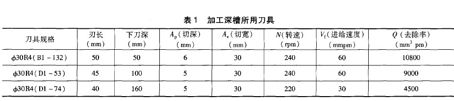 編深槽程序時(shí),將刀具分三個(gè)系列,先用 φ 30R4 下刀深為50mm銑刀加工上半部分,再用 φ 30R4下刀深為100mm加工中間部分,最后用 φ3oR4下刀深為160mm加工底部。側(cè)面用 φ 30R4銑刀加工到位,僅用 φ 20R4銑刀補(bǔ)銑轉(zhuǎn)角。編制加工耳片型面程序時(shí),通過(guò)改變刀軸方向, 實(shí)現(xiàn)應(yīng)用最短刀具加 工。(所用刀具見(jiàn)表1)