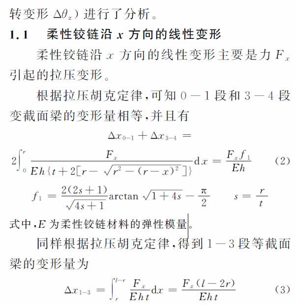 柔性鉸鏈利用其自身的彈性變形而非剛性元件的運動來傳遞或轉換運動、力或能量,相對于傳統(tǒng)運動鉸鏈,柔性鉸鏈具有運動分辨率高、無摩擦、無需潤滑、制造工藝簡單等優(yōu)點,已被廣泛應用于投影光刻物鏡、硅片工作臺、電子掃描顯微鏡、空間光學遙感器[7飊8]等精密器件,以及精密和超精密加工等領域。柔性鉸鏈的柔度是柔性鉸鏈、柔順機構的關鍵參數,直接關系到柔順機構的動態(tài)特性及其末端的定位精度。國內外圍繞柔性鉸鏈的柔度開展了很多研究工作。Paros等推導了單軸和雙軸圓弧形柔性鉸鏈柔度的精確計算公式以及簡化公式。吳鷹飛等給出了圓弧形柔性鉸鏈柔度更為簡潔的計算方法。Smith等給出了橢圓形柔性鉸鏈的柔度矩陣計算方法,并通過有限元和實驗的方法進行了驗證。Lobontiu等[14]基于卡氏第二定理建立了直梁圓角形柔性鉸鏈柔度的理論模型,并將其應用到平面運動放大機構中,但該理論模型沒有考慮剪切力的影響。Hale[15]對直梁圓角形柔性鉸鏈進行了分析,建立了其柔度矩陣的計算模型,但模型僅考慮了柔度矩陣對角線的元素。Xu等通過有限元方法對圓弧形、直梁圓角形和橢圓形柔性鉸鏈的運動精度進行了分析。
