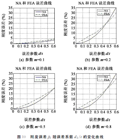 結(jié)合計算結(jié)果和圖9可知,NA 和FEA 的誤差曲線較為吻合,鉸鏈參數(shù)m 對誤差β1幾乎沒有影響,但是誤差系數(shù)d1/t對剛度的影響較大,取m=0.1,當(dāng)誤差系數(shù)d1/t為0.3時,NA和FEA的剛度誤差分別可達93.44%和82.5%。